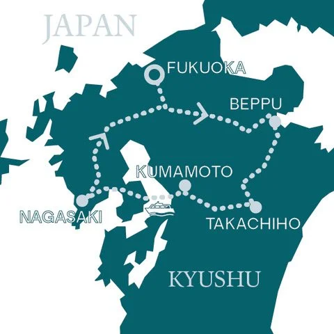 Fukuoka (3n), Beppu (3n), Takachiho (1n), Kumamoto (2n), Nagasaki (3n), Fukuoka (2n)